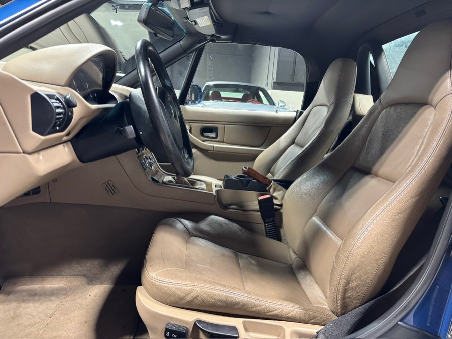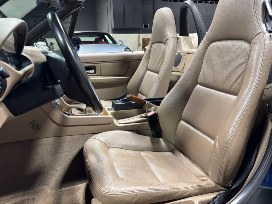 Immaculate one owner 6 speed manual Z3 3.0i. Finished in Topaz Blue Metallic over Sand Beige Leather w Burr Walnut Trim. Optioned w BMWs Premium Package, Heated Seats, 17” Multi Spoke Alloys, Harmon Kardon Sound System and Power Top. Full service performed at our facility including oil and filter, plugs, transmission service and new Yokohama Apex performance tires.