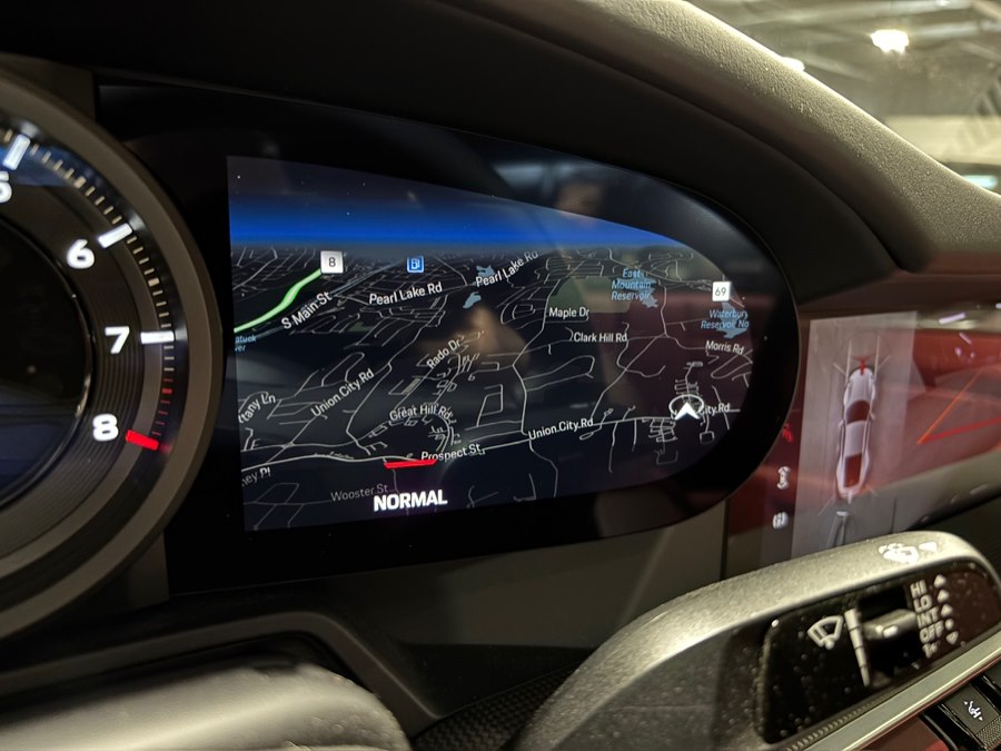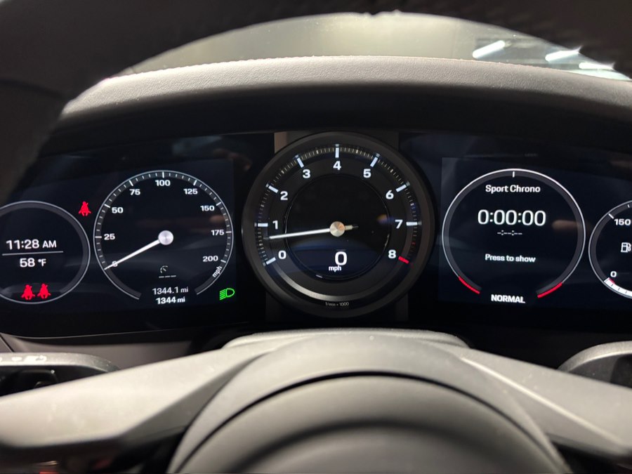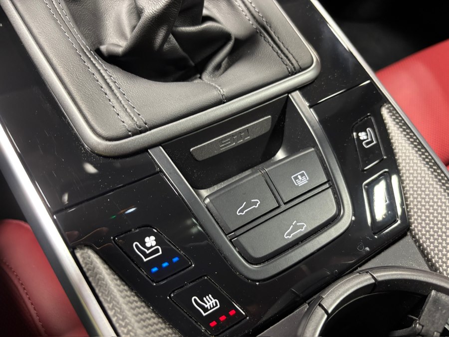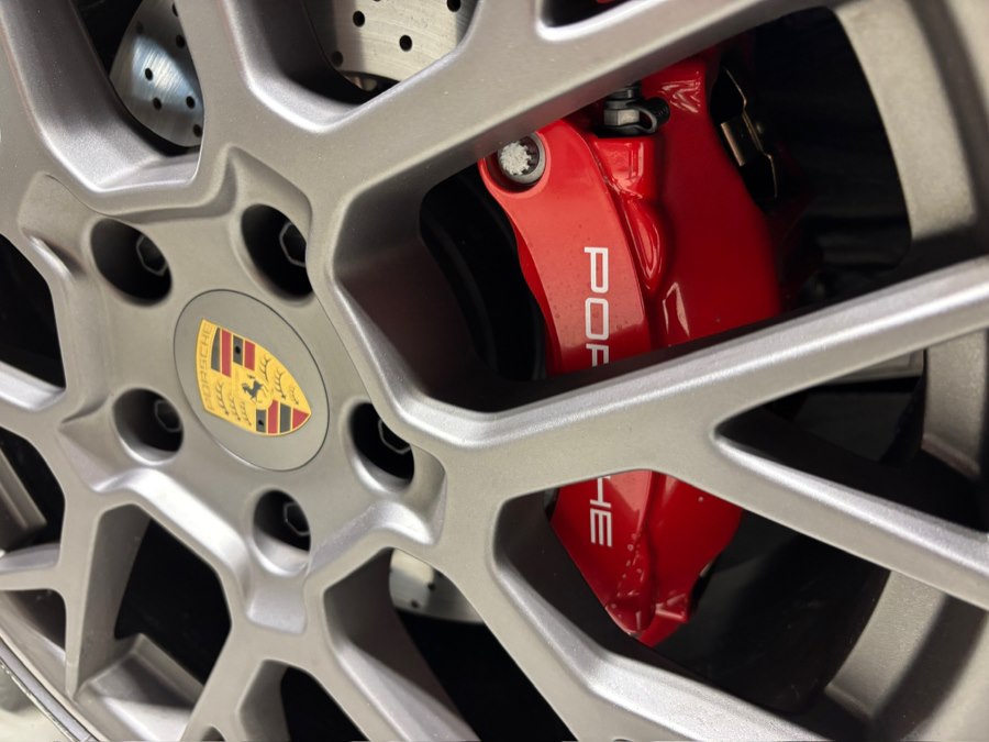 Inside, the cabin is richly appointed with 14-way power sport seats with memory, ventilated front seats, ambient lighting, and the 930 Leather Package. Driver-focused features include a GT Sport steering wheel in leather, matte carbon fiber interior trim, and Porsche crests embossed on the front headrests.